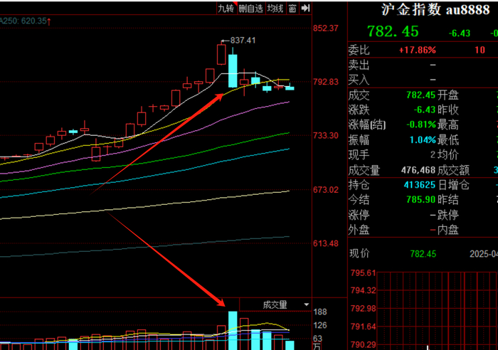 值得注意的是,近日沪金指数,在经过加速上涨之后,在历史高位留下了天量阴线。