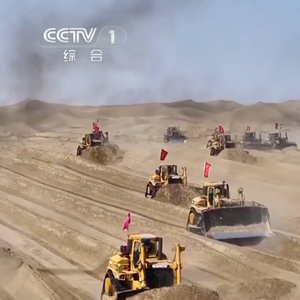 在位于塔克拉玛干沙漠南缘的新疆昆玉市,7.38万亩土地开发建设项目进入攻坚阶段。上百台装载机、平地机在沙海中来回奔忙,原本丘壑纵横的流动沙丘经过连续作业,逐渐变得平整,显露出田垄的轮廓。