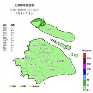 5月4日20时到5月5日10时雨量统计显示,上海全市普降小雨,崇明局部中雨。早间凉意明显,全市气温起步在15~17℃之间。白天仍有阵雨天气,大部分地区小到中雨,奉贤和浦东东南部等地稍微明显些,今天夜里逐渐雨止转多云。受降雨影响,全天气温不高,最高气温仅有20℃。风力较大,东南风4-5级,沿江沿海地区5级阵风6-7级,傍晚转偏北风4-5级。