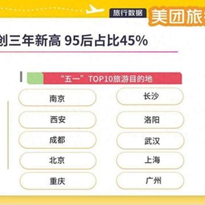 “五一”假期期间,江苏省吃喝玩乐服务消费规模居全国各省第二名,同比增速达到21%,南京、苏州、无锡热度最高。其中,江苏住宿消费较上年假期增长46%,旅游景点类消费增长31%。……5月5日,美团旅行发布2025“五一”假期吃喝玩乐消费洞察。数据显示,在味蕾游、演出游、赶海游、奔县游等多样玩法推动下,人们出游热情高涨,今年“五一”假期,文旅热度创近三年新高,文旅订单较2023年同期增长30%,TOP10热门目的地为南京、西安、成都、 北京、重庆、长沙、洛阳、武汉、上海、广州,其中,由异地游客贡献的餐饮堂食线上交易额较2023年激增189%。