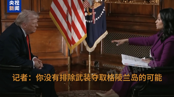 针对“使用军事力量吞并格陵兰岛”的说法,特朗普表示“不排除”这种可能。他在采访中表示,他对武装夺取格陵兰岛这件事情的发生仍持“怀疑态度”,但他表示这种可能性“肯定”存在。