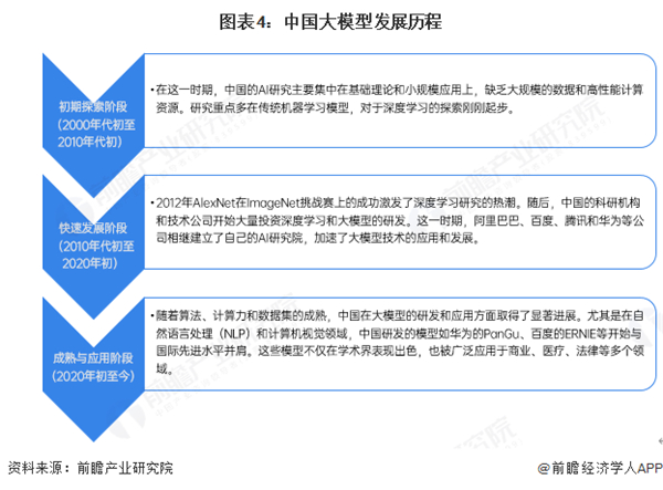 中国大模型发展经历了三个主要阶段。初期探索阶段(2000年代初至2010年代初)主要集中在基础AI理论和小规模应用的研究,缺乏大规模数据和高性能计算资源。随着2012年深度学习的兴起,进入了快速发展阶段(2010年代初至2020年初),期间国内大企业如阿里巴巴、百度、腾讯和华为开始大力投资AI技术,推动了大模型技术的发展和应用。到了成熟与应用阶段(2020年初至今),中国在自然语言处理和计算机视觉等领域的大模型技术已达到国际先进水平,模型广泛应用于商业、医疗、法律等多个行业。展望未来,预计中国将进一步加强跨模态、多任务学习的应用,提升模型的透明度和安全性,巩固其在全球AI竞争中的地位。