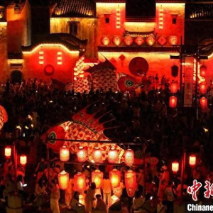 5月3日,众多游客来到安徽省黄山市徽州区呈坎古村落观赏体验非遗鱼灯巡游,感受徽州民俗魅力。(无人机照片)施亚磊 摄