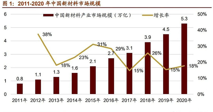 根据西部证券研发中心的报告,2020-2025年间新材料产业的复合增长率预计会达到13.3%,预计将在2025年达到5.6万亿美元,我国新材料产业总值也望突破10万亿元大关。