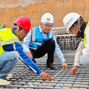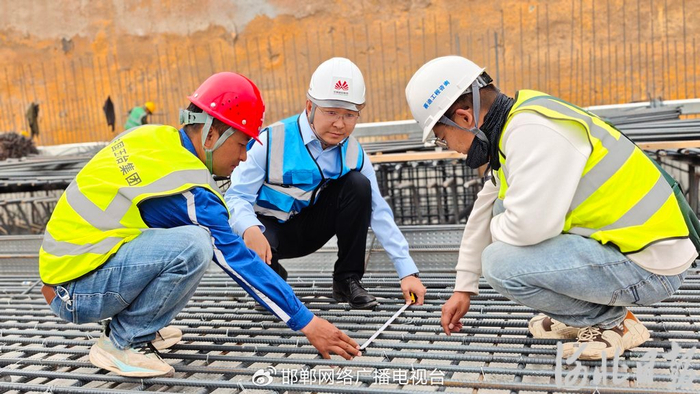 5月4日,金融岛站周边一体化开发项目建设现场,张加健(中)与监理、项目总包人员一起,对B地块筏板作业区进行钢筋间距检查。河北日报记者 曹 铮摄