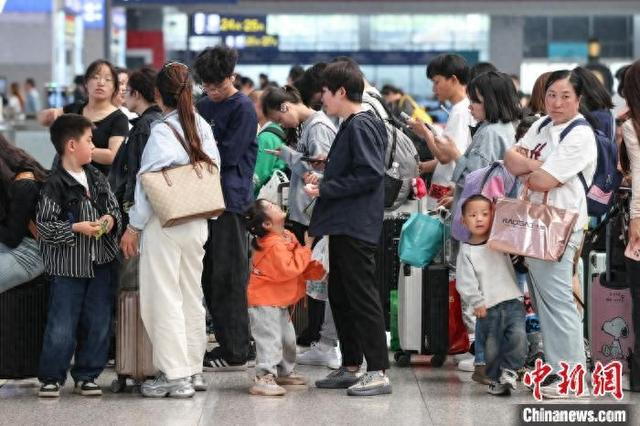 5月5日是“五一”假期最后一天,位于贵州省贵阳市观山湖区的贵阳北站迎来返程客流。图为旅客在贵阳北站排队检票。中新社记者 瞿宏伦 摄