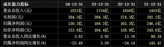 具体看,从2021年至2024年,万华化学的营收规模从1455亿元增长至1821亿元,整体保持上升趋势。不过,盈利端承压,该公司的归属净利润规模分别为246.5亿元、162.3亿元、168.2亿元、130.3亿元。