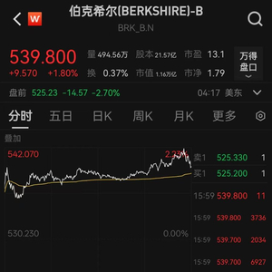 北京时间5月5日16:17,美股伯克希尔·哈撒韦公司B类股盘前下跌2.7%。