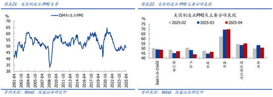 美国4月ISM制造业PMI为48.7%,高于预期值48.0%,低于前值49.0%,是过去5个月最低。从主要分项来看,新订单和就业指数小幅回升但仍处于收缩区间,产出指数明显下滑,物价指数继续攀升至69.8%的极高水平。综合看,美国经济“滞胀”特征进一步强化,不过目前为止“胀”的程度要强于“滞”。