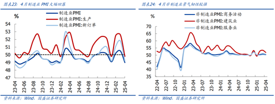 国内方面,4月制造业PMI回落幅度大于季节性,降至收缩区间,非制造业PMI也小幅回落。4月制造业PMI为49.0%,较前值回落1.5个百分点,回落幅度远大于季节性(2015-2024年4月PMI环比变动中位数为-0.5个点),重回收缩区间,创2023年12月以来新低。4月非制造业PMI回落0.4个百分点至50.4%,其中服务业、建筑业PMI分别回落0.2、1.5个百分点。4月综合PMI产出指数回落1.2个百分点至50.2%,指向整体经济扩张明显放缓,主因前期制造业较快增长形成高基数、关税冲击显现等影响。