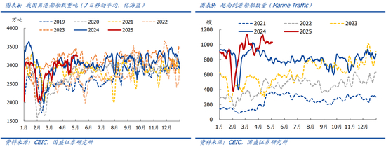 1)出口高频数据:中国对美出口高频数据显著走弱、但对越南等地出口大增,4月出口很可能不会大幅转负。货运公司Vizion数据显示,4月前四周,中国至美国航线的集装箱预定量同比分别为-5.4%、-21.3%、-44.5%、-48.6%;合计看,4月中国至美国航线的集装箱预定量同比下降32.7%,环比下降25.8%。然而,整体看,我国出口相关高频指标仍有韧性,比如:①集装箱吞吐量:按照交通部统计数据,4月前四周,我国集装箱吞吐量同比增7.3%,环比增4.8%;②离港船舶载重量:按照亿海蓝会公布的日度船舶到港、在港、离港数据,4月我国离港船舶载重吨同比增1.4%,环比增3.6%,指向我国出口仍有韧性。背后的原因在于:虽然对美出口大幅下滑,但我国对越南等地的转口贸易增加,一定程度上抵消了对美出口的下降,比如Marine Traffic数据显示,4月越南港口到港、离港船舶数量同比增速分别为24.2%、26.3%,创历史同期新高。