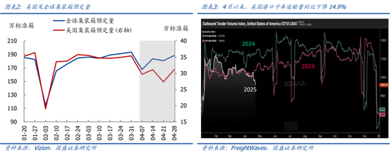 1)集装箱预定量:货运公司Vizion的周度数据显示,4月全球集装箱预定量同比下降7.1%,环比下降4.6%;美国集装箱预定量同比下降12.8%,环比下降14.9%。