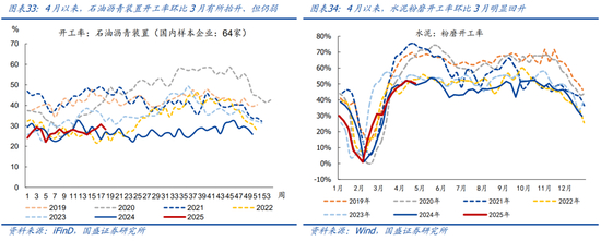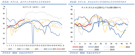 4月以来,上游开工多数回升、但不同行业品类强弱存在差异,其中:高炉、焦化偏强,沥青、水泥偏弱。4月以来,全国247家样本高炉开工率均值环比3月抬升2.5个百分点至约83.6%、创近年同期次高,环比强于同期均值(2019-2024年同期均值为升2.3个百分点),相比2024年同期偏高约4.9个百分点。焦化企业开工率均值环比3月回升2.1个百分点至约69.0%、仍在近年同期偏低水平,强于同期均值(2019-2024年同期均值为升0.2个百分点),相比2024年同期偏高7.8个百分点。石油沥青装置开工率均值环比3月提升0.8个百分点至约28.2%、仍在同期低位,弱于同期均值(2019-2024年同期均值为升2.1个百分点),相比2024年同期偏高约1.5个百分点。水泥粉磨开工率均值环比3月回升10.7个百分点至约50.9%、续创近年同期第3低,弱于同期均值(2019-2024年同期均值为升14.7个百分点),相比2024年同期偏高0.5个百分点。