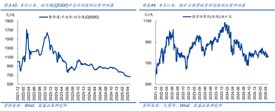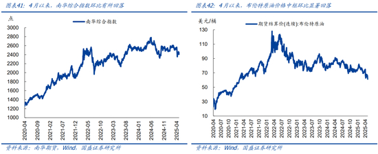 上游资源品:南华综合指数环比有所回落,原油、煤炭、铁矿石等大宗价格全线下跌。4月以来,南华综合指数均值环比回落3.4%,同比降幅扩大至7.7%。重点大宗商品中:布伦特原油价格环比大降7.0%、收于61.3美元/桶,相比2024年同期跌幅扩大至25.3%,主因美国大幅加征关税导致美国衰退、全球贸易萎缩预期升温。黄骅港Q5500动力煤平仓价均值环比下跌2.4%、收于660元/吨,相比2024年同期均值跌幅扩大至18.9%。铁矿石期货(连续合约)结算价环比下跌2.5%、收于761.5元/吨,相比2024年同期均值下跌10.8%。