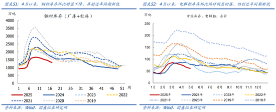 工业金属:钢材、电解铝库存均明显回落,绝对值再创近年同期新低。4月以来,钢材库存环比3月末减少13.2%、录得1325.5万吨,续创近年同期最低,相比2024年同期降幅扩大至23.9%。电解铝库存环比3月下降17.6%,降幅大于近年同期季节规律(2017-2024年同期均值为-5.3%),绝对值再创近年同期新低,同比下降20.1%。