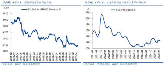中游工业品:4月钢材价格续跌,水泥价格环比3月均值小幅回升。4月以来,螺纹钢现货价格均值环比3月下跌1.7%,再创近年同期新低,相比2024年同期下跌11.0%。水泥价格指数均值环比3月均值上涨0.9%、收于124.55点,同比上涨18.4%。