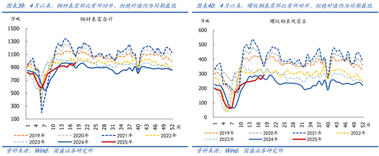 钢材表观、螺纹表需均值环比回升,强于季节规律、但绝对值仍为同期最低。4月以来,钢材表观需求均值环比增4.8%至约933.3万吨、续创近年同期新低,环比略强于季节规律(2019-2024年同期环比均值为4.1%),相比2024年、2019年同期分别偏低1.5%、17.1%。其中,螺纹钢表需环比增12.8%至约265.6万吨、仍为近年同期最低,环比同样强于近年同期均值(2019-2024年同期环比均值为增4.7%),相比2024年、2019年同期分别偏低5.0%、34.7%。