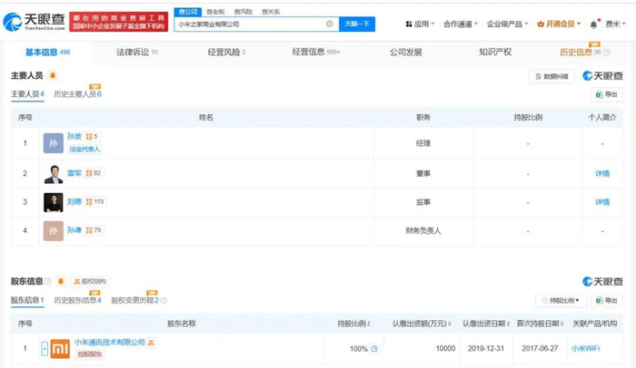 资料显示,该公司成立于2017年6月,法定代表人为孙波,注册资本1亿人民币,经营范围包括通讯设备销售、通信设备销售、计算机软硬件及辅助设备批发等,由小米通讯技术有限公司全资持股。