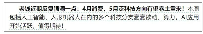 3、从假期消息面来看,泛科技方向催化密集!无论人工智能还是机器人方向都有利好催化,节后甚至整个5月的主线,大概率围绕:AI大模型、算力、AI芯片,人形机器人展开。
