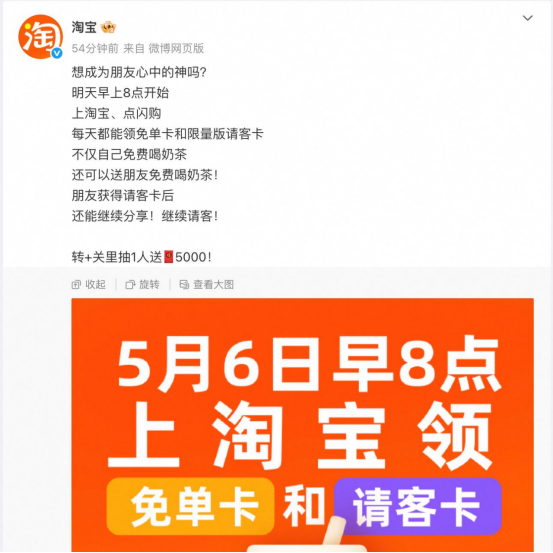 淘宝闪购最大力度送福利,长期上线免单卡请客卡:送1亿杯奶茶!