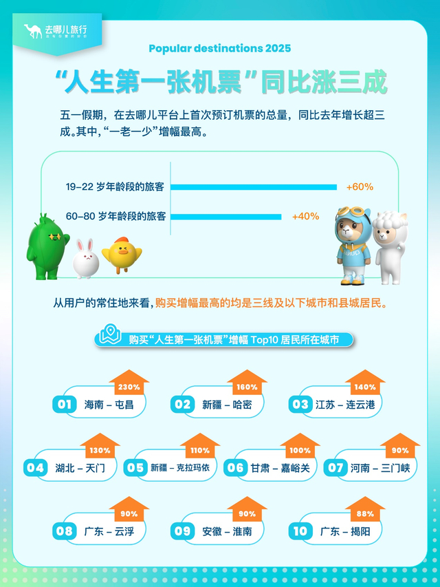 去哪儿平台上,“人生第一张机票” 购买量同比涨三成,19 - 22 岁大学生旅游热情高涨,而 “新银发” 群体在五一期间酒店预订增幅同比达 43%,他们更看重出游质量和情绪价值,倾向于选择含有徒步、户外等元素的景区 。