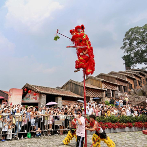5月2日,在广东省佛山市禅城区南风古灶旅游休闲街区,游客在观看醒狮表演。新华社发(黄继明 摄)