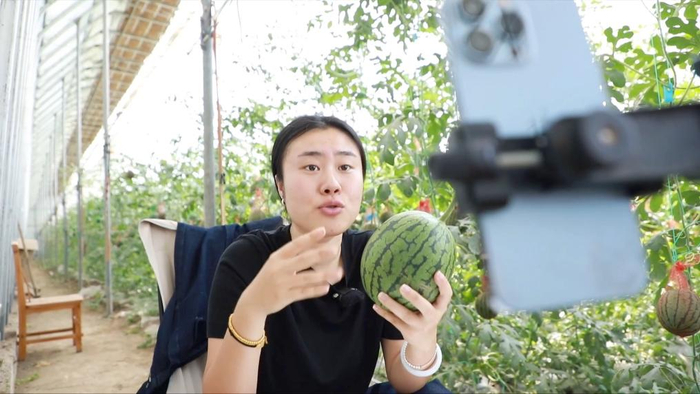 位于山东省淄博市的淄川经济开发区佰川果蔬种植农场,“00后”新农人丁萌萌正在直播。2023年大学毕业后,丁萌萌回到家乡和父亲一起种植大棚果蔬,并通过网络平台将产品卖到全国各地。