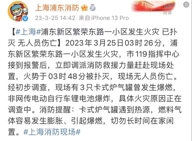 2023年3月25日凌晨03点多,浦东新区繁荣东路一小区发生火灾,好在火势很快被扑灭,现场无人员伤亡。经初步调查,现场有3只卡式炉气罐发生爆燃。