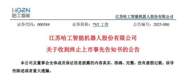《终止上市事先告知书》显示,因2023年度财务会计报告被出具无法表示意见的审计报告,*ST工智股票交易自2024年5月6日起被实施退市风险警示。
