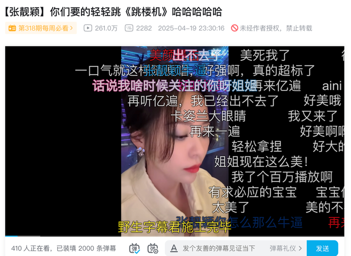 在《天赐的声音6》首期节目中,张靓颖与王以太的“吵架版”《跳楼机》以更具戏剧性的表达,让这首歌跳脱出短视频的碎片化语境,拥有了更完整的音乐叙事。《乘风2025》三公选歌时,该歌曲更是引发了“修罗场”。祝绪丹摇着王珞丹的胳膊说:“我喜欢我喜欢,你给我抢到这个。”宋妍霏也表示:“这首歌很火,非常火。”而叶童更是毫不犹豫地直接将《跳楼机》写在了抢歌板上,一旁的彭小苒也坚定地表示:“就抢这首,拼了拼了。”