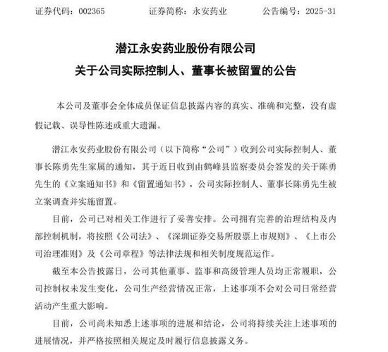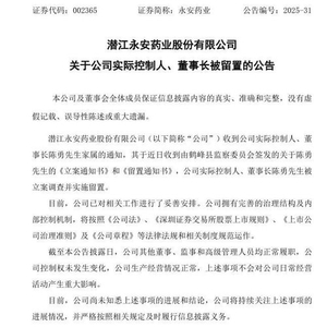 5月5日,永安药业(002365.SZ)发布公告称,公司收到实际控制人、董事长陈勇家属的通知,其于近日收到由鹤峰县监察委员会签发的关于陈勇的《立案通知书》和《留置通知书》,公司实际控制人、董事长陈勇被立案调查并实施留置。