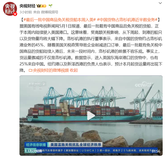 此外,最后一批载有中国商品且免关税的货船,正于本周内陆续驶入美国港口。这意味着,受高额关税影响,从下周起,到港的船只以及货物量均将大幅下降。