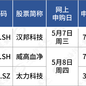 据目前安排,若无变化,本周(5月6日至8日)有3只新股可申购,分别为科创板1只、创业板1只和沪市主板1只。