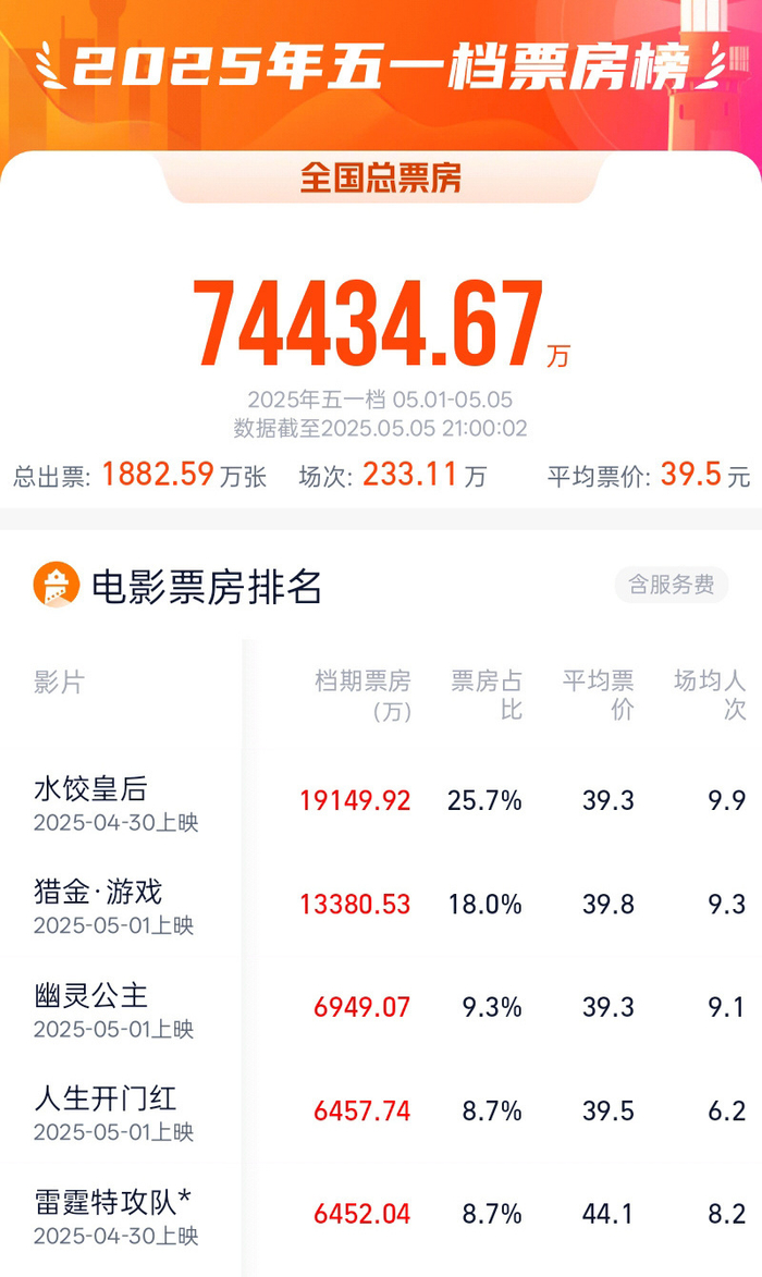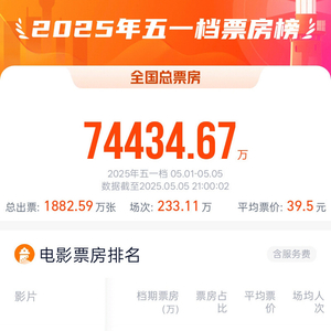 2025五一档电影票房7.44亿 环球网 环球网官方账号 2025.05.0521:18 关注 转自:央视据网络平台数据,截至5月5日21时,2025年五一档(5月1日—5月5日)票房7.44亿。影片《水饺皇后》《猎金·游戏》《幽灵公主》暂列前三名。 (总台央视记者 许盼盼)
