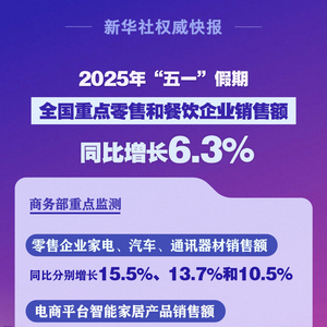 记者5月5日从商务部获悉,2025年“五一”假期,全国消费市场繁荣活跃。据商务部商务大数据监测,假期全国重点零售和餐饮企业销售额同比增长6.3%。