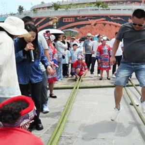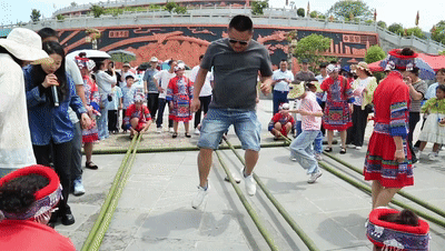 走进贵州省余庆县飞龙寨景区游客中心广场,身着苗族盛装的演员们手持竹竿,游客随着欢快的节奏跳起迎宾舞。笑声与竹竿敲击声交织成独特的韵律。