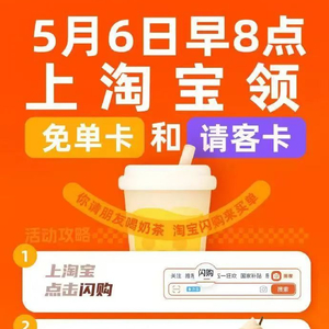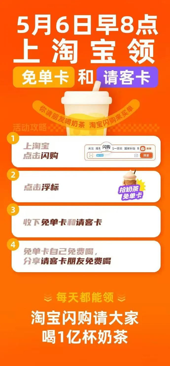 根据免单活动显示,从5月6日8时开始,消费者每天打开淘宝App——闪购频道,搜索“奶茶免单”,就能抢到奶茶“免单卡”,总共1亿杯,咖啡、茶饮都可以。此外,消费者获得“免单卡”同时,还有机会随机获得1~9张“请客卡”,请朋友免费喝奶茶。