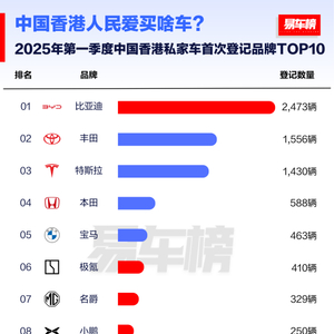 中国香港:据易车数据统计,比亚迪及旗下高端品牌腾势在2025年一季度以0.25万辆销量超越丰田、特斯拉,首次登顶全品牌销量榜首,双品牌合计市占率超30%,相当于每3辆新车中就有1辆来自比亚迪。