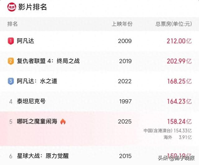 据网络平台数据,截至5月5日,《哪吒之魔童闹海》(《哪吒2》)总票房(包含港澳台和海外票房)已突破158亿元,排名全球影史票房第五。这个五一假期《哪吒2》票房继续增长,有望超越《泰坦尼克号》。