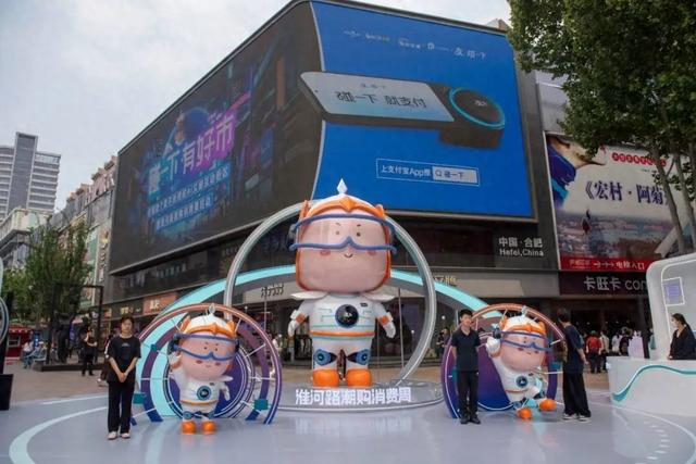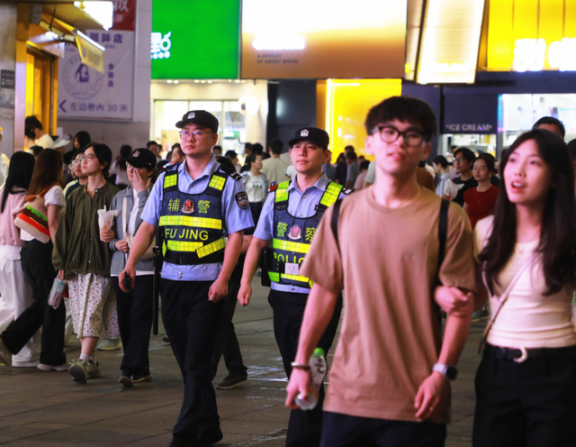 “五一”假期,全国首个数字消费与AI文旅互动街区在淮河路步行街正式亮相,街区人潮涌动,热闹非凡。一队警容严整、精神抖擞的巡逻民警穿梭于人群之中,让游客们在平安祥和的氛围中尽享假日休闲时光。