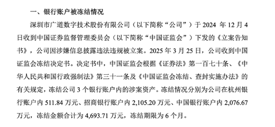 2025年3月,证监会冻结广道数字在杭州银行、招商银行及中国银行账户内涉案资金4693.71万元,冻结期限6个月。