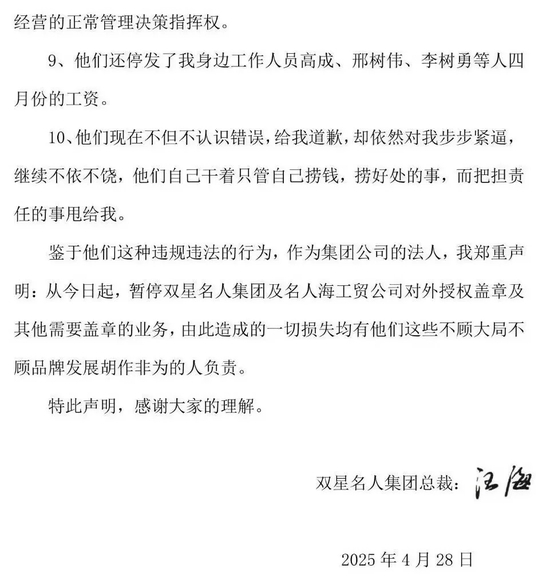 鉴于他们这种违规违法的行为,作为集团公司的法人,我郑重声明:从今日起,暂停双星名人集团及名人海工贸公司对外授权盖章及其他需要盖章的业务,由此造成的一切损失均由他们这些不顾大局不顾品牌发展胡作非为的人负责。