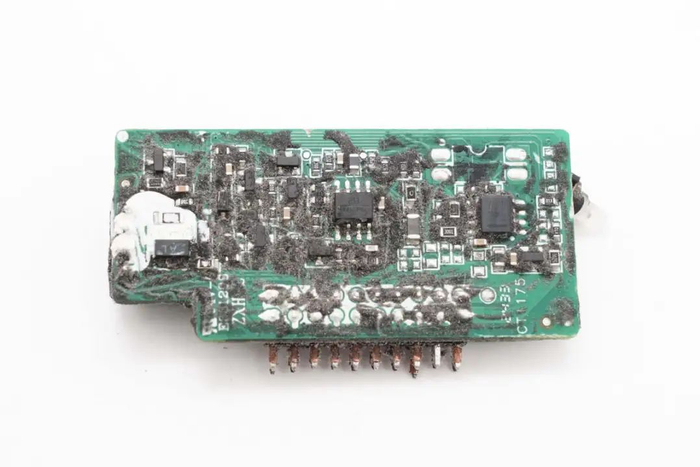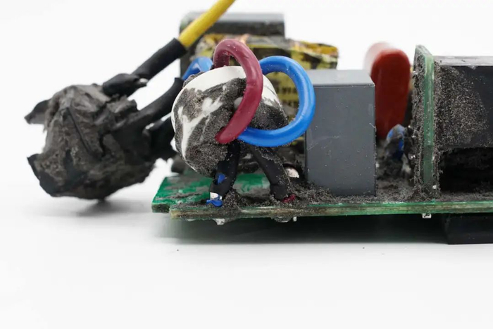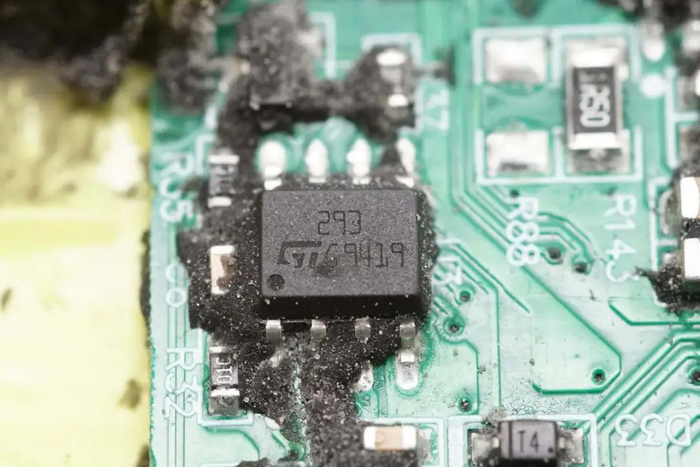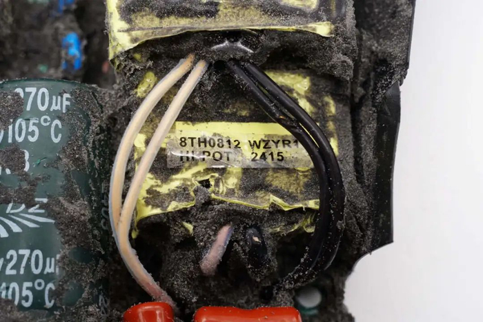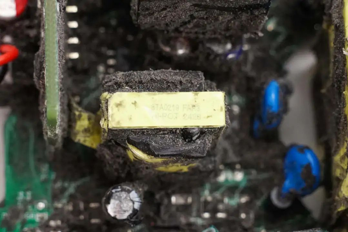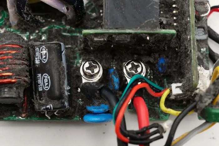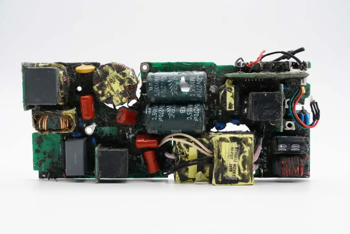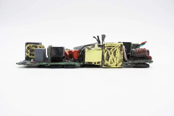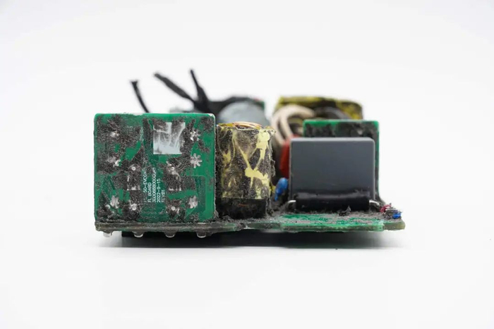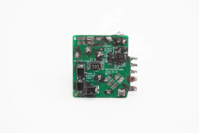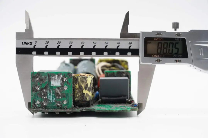 切掉充电器两侧外壳,清理掉填充的导热胶,拧下固定螺丝,从壳体中取出PCBA模块。