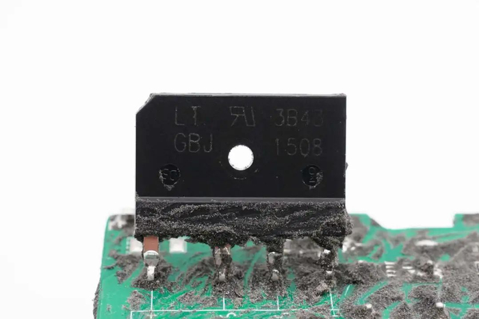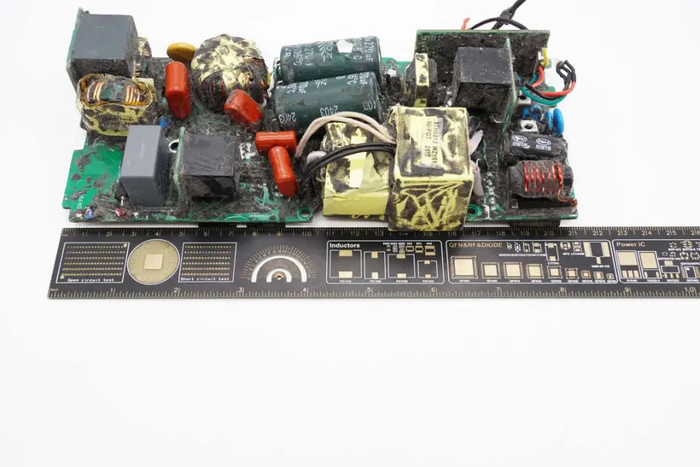 PCBA模块背面一览,右侧上方设有整流桥,下方设有两颗LLC开关管。中间位置设有PFC开关管和整流管,左下角设有两颗整流管。对应PFC电感,谐振电感和变压器位置镂空降低厚度。