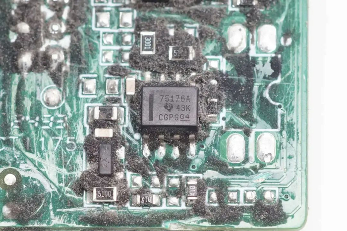 收发器芯片来自德州仪器,型号SN75176A,用于5Mbps速率以下的RS485通信,芯片具备三态驱动器和接收器输出,具备单独的驱动器和接收器使能引脚,具备60mA驱动器输出能力,具备热关断保护,采用SOIC-8封装。
