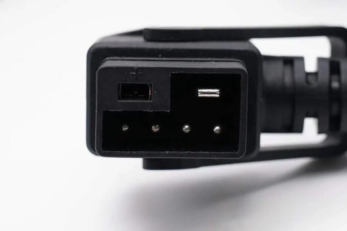 新国标输出端子特写,为锂离子电池插头,采用两根电力插针和四根通讯插针的形式。通讯插针用于充电器与电池通信,完成握手后,确认充电器可以为电池充电后,才会开启输出为电池充电。