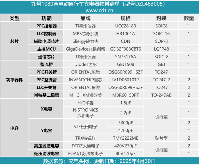 最后附上九号1080W电动自行车锂电池充电器的核心器件清单,方便大家查阅。