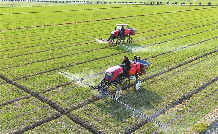 在江苏省南通市通州区十总镇育民村高标准农田,农民驾驶植保机械对进入返青期的小麦开展病虫害防治作业(资料图片)。南通市着力推广绿色生态种植、先进农业机械应用、土壤改良、病虫害统防统治、新品种和良种繁育等技术,着力打好绿色发展“组合拳”,既夯实了粮食生产基础,又筑牢了粮食安全屏障。新华社发