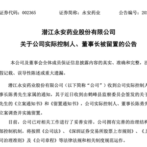 5月5日,牛磺酸行业龙头永安药业(002365)突发重磅消息,让资本市场为之震动。公司发布公告称,收到公司实际控制人、董事长陈勇家属通知,陈勇近日收到鹤峰县监察委员会签发的《立案通知书》和《留置通知书》,被立案调查并实施留置。