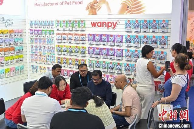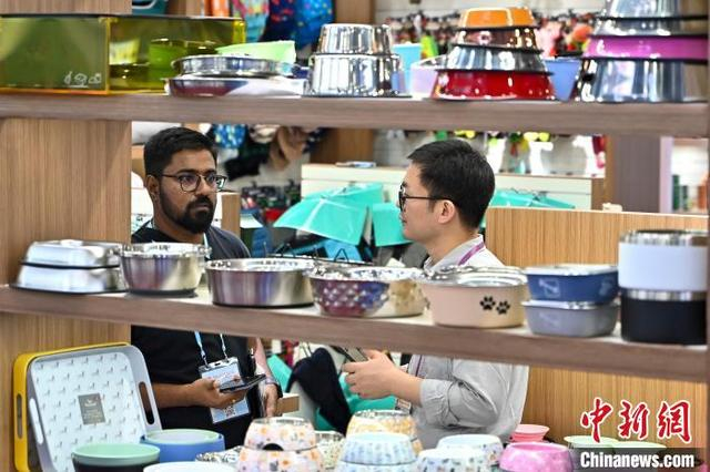 5月3日,广交会境外采购商在宠物用品展区与参展商洽谈。正在广州举办的第137届中国进出口商品交易会(广交会)第三期展会上,从精致可爱的宠物玩具到智能化的自动喂食机,琳琅满目的宠物产品吸引来自世界各地的采购商询价下单订货。中新社记者 陈骥旻 摄